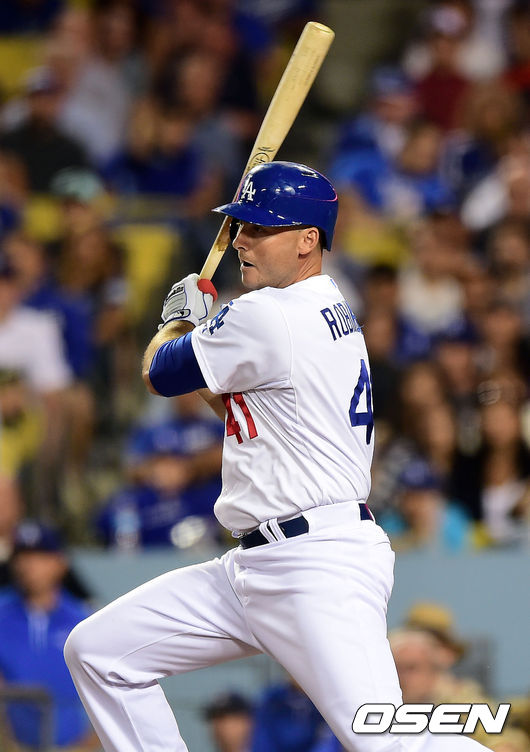 7회말 2사 1,3루 다저스 로빈슨이 적시타를 때리고 있다.