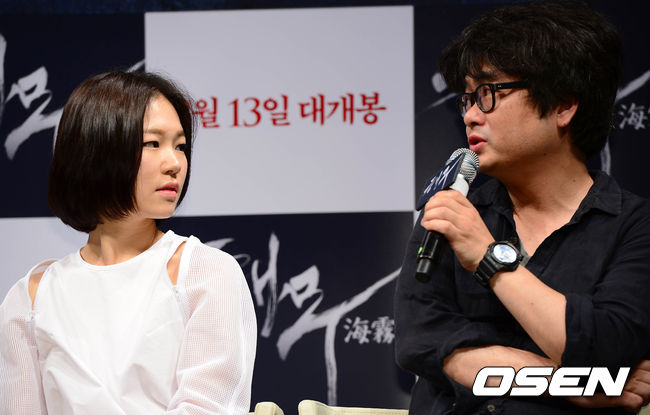 1일 오전 서울 압구정 CGV에서 진행된 영화 '해무' 제작보고회에서 배우 한예리가 질문에 답변하는 심성보 감독을 바라보고 있다.