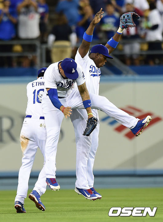 승리를 거둔 다저스 이디어, 켐프, 푸이그가 세레머니를 하고 있다./youngrae@osen.co.kr