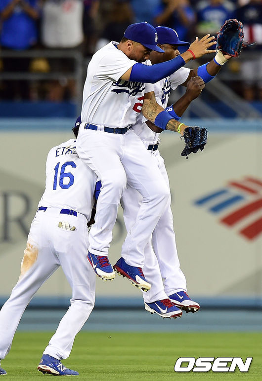 승리를 거둔 다저스 이디어, 켐프, 푸이그가 세레머니를 하고 있다./youngrae@osen.co.kr