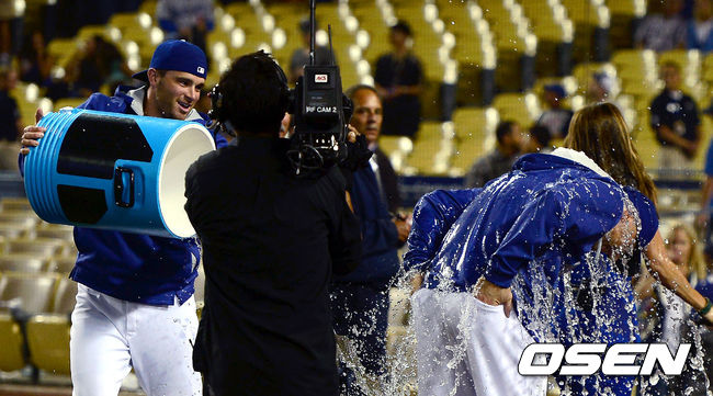 다저스 부테라가 결승타를 때린 로빈슨에게 물을 뿌리고 있다./youngrae@osen.co.kr
