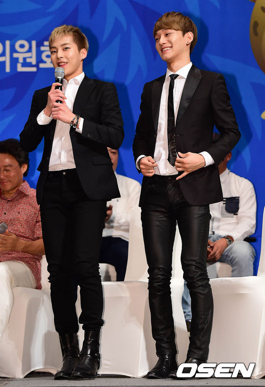 엑소 시우민과 첸이 인사말을 하고 있다.
