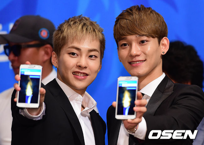 엑소 시우민과 첸이 스마트 성화봉송 포즈를 취하고 있다.