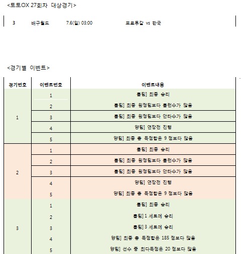 국민체육진흥공단(www.kspo.or.kr)이 발행하는 체육진흥투표권 수탁사업자인 스포츠토토(www.sportstoto.co.kr)가 오는 5일(토)과 6일(일)에 벌어지는 KBO 두산-삼성(1경기), KBO 넥센-KIA(2경기) , 배구월드리그 포르투갈-한국(3경기) 등 3경기를 대상으로 ‘토토OX’ 27회차를 발매한다고 밝혔다.