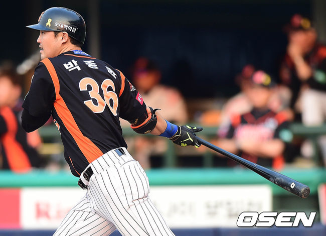 1회초 롯데 공격 2사 1, 3루 상황 박종윤이 선제 1타점 우전 적시타를 날리고 있다.