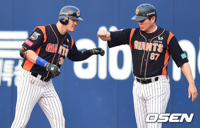 1회초 롯데 공격 2사 1, 3루 상황 박종윤이 선제 1타점 우전 적시타를 날리고 1루에 안착한 뒤 김응국 코치와 인사를 나누고 있다.