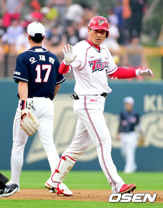 1회말 무사에서 KIA 김주찬이 2루타를 날리며 타임을 외치고 있다.