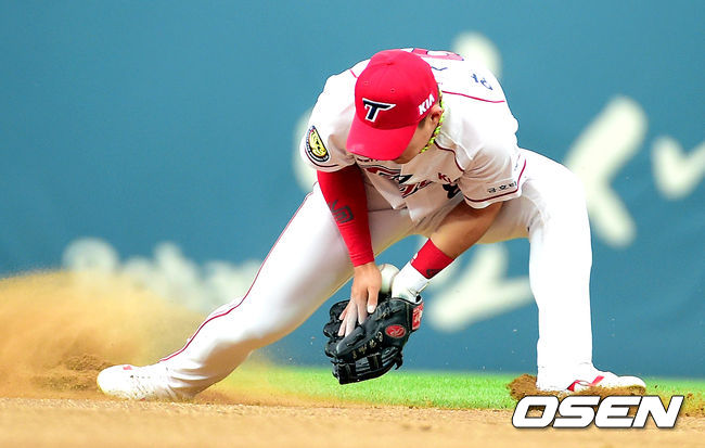 1회초 2사에서 KIA 안치홍이 두산 민병헌의 2루수 땅볼 타구를 놓치고 있다. 민병헌은 1루에서 세이프.