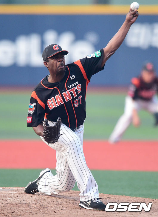 롯데 선발 유먼이 힘차게 공을 뿌리고 있다.