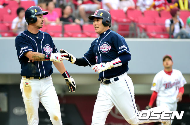 2회초 1사 2,3루에서 두산 최재훈의 선제 2타점 적시타에 오재원, 이원석이 홈을 밟고 하이파이브를 하고 있다.