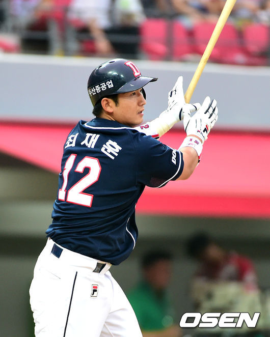 2회초 1사 2,3루에서 두산 최재원이 선제 2타점 적시타를 날리고 타구를 바라보고 있다.