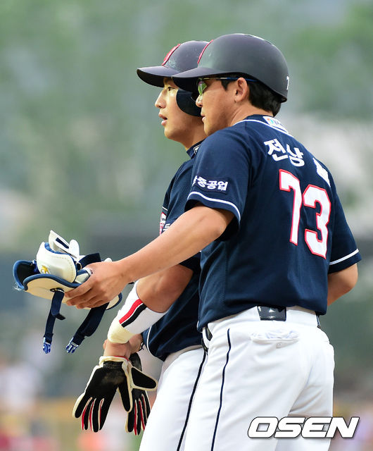 2회초 1사 2,3루에서 두산 최재원이 선제 2타점 적시타를 날리고 전상렬 코치와 이야기를 나누고 있다.