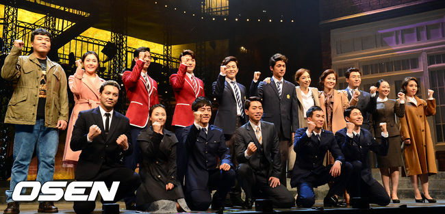 1일 오후 대학로 홍익대 아트센터 대극장에서 열린 뮤지컬 '블러드 브라더스' 의 배우들이 모두 모여 공연 흥행을 위한 화이팅을 외치고 있다.