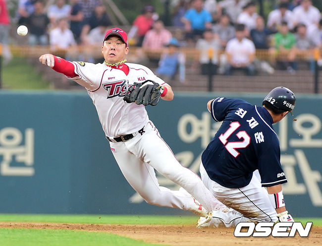2회초 1사 1루에서 KIA 안치홍이 두산 허경민의 2루땅볼 타구에 최재훈을 포스아웃시키고 1루로 송구하고 있다.