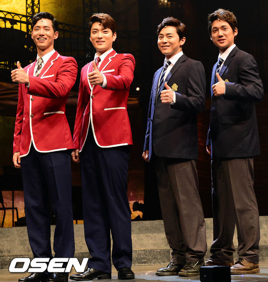1일 오후 대학로 홍익대 아트센터 대극장에서 열린 뮤지컬 '블러드 브라더스' 의 4인방 송창의,조정석,장승조,오종혁이 엄지 손가락을 추켜세우고 있다.