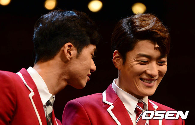 1일 오후 대학로 홍익대 아트센터 대극장에서 열린 뮤지컬 '블러드 브라더스' 무대인사 중 배우 오종혁이 장승조에게 귓속말 하고 있다.