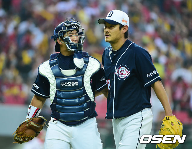 3회말 수비를 마치고 두산 최재훈, 노경은이 서로를 격려하며 더그아웃으로 향하고 있다. 노경은은 2사 3루에서 폭투로 1실점 했다.