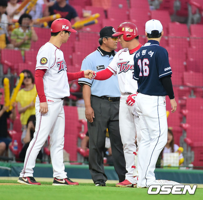 3회말 1사에서 KIA 김주찬이 3루타를 날리고 김종국 코치와 주먹을 맞대고 있다.