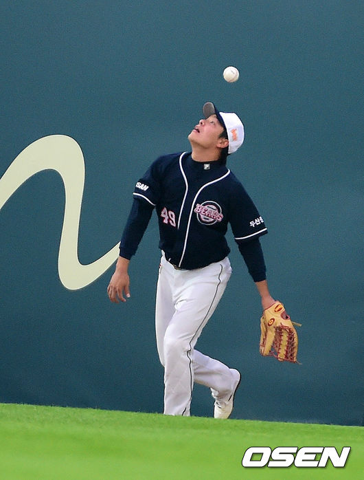 3회말 1사에서 두산 민병헌이 KIA 김주찬의 3루타에 펜스맞고 굴절된 볼을 찾고 있다.
