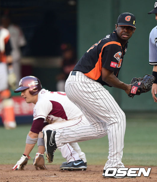 3회말 넥센 공격 1사 1, 2루 상황 롯데 선발 유먼의 폭투를 틈타 2루 주자 이택근이 홈까지 내달려 세이프됐다. 1루에서 3루까지 간 주자를 바라보는 롯데 선발 유먼.