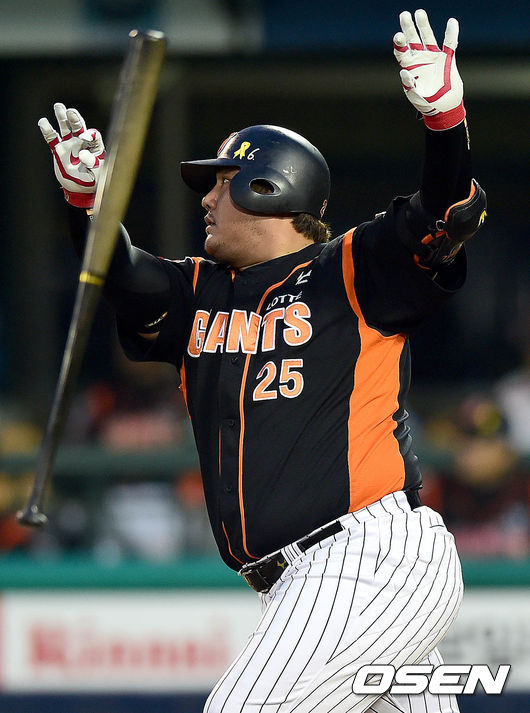 5회초 롯데 공격 1사 주자없는 상황 최준석이 추격의 우월 솔로포를 날리고 타구를 바라보고 있다.