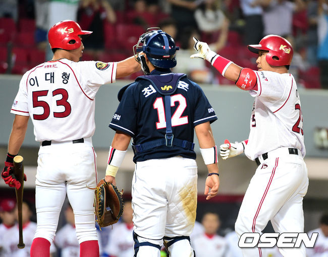6회말 무사 1루에서 KIA 이범호가 투런포를 날리고 이대형과 세레모니를 하고 있다.
