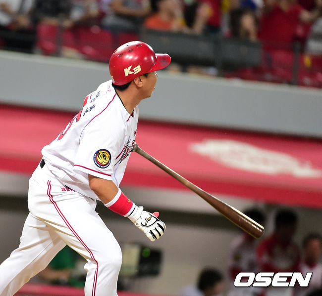 6회말 무사 1루에서 KIA 이범호가 투런포를 날리고 타구를 바라보고 있다.