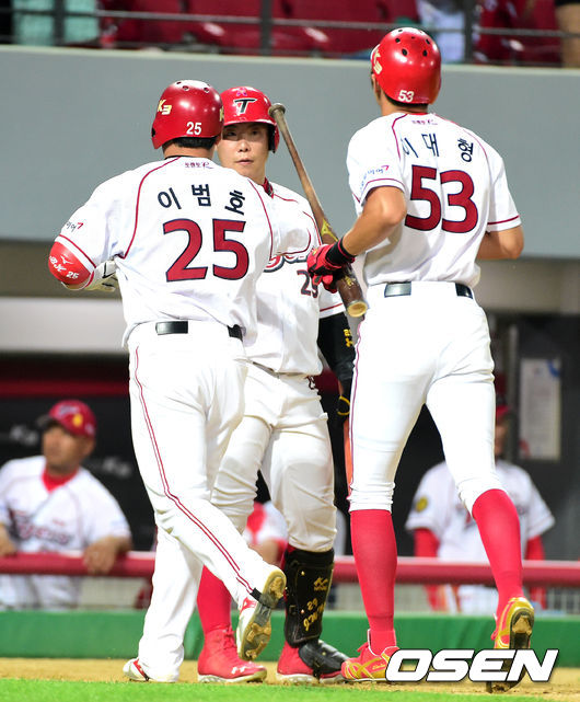 6회말 무사 1루에서 KIA 이범호가 투런포를 날리고 나지완과 하이파이브를 하고 있다.