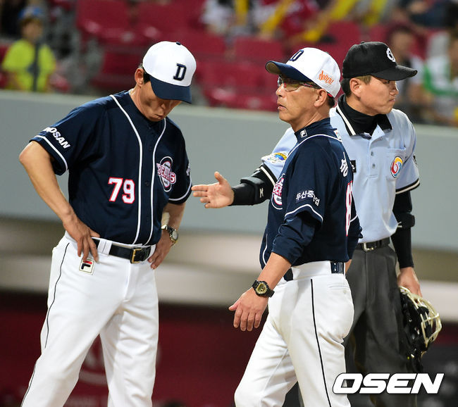 8회말 무사 1루에서 두산 송일수 감독이 KIA 이대형의 번트 모션에 스윙 판정이 나오지 않자 그라운드로 나와 권영철 구심에 불만을 나타내고 있다.