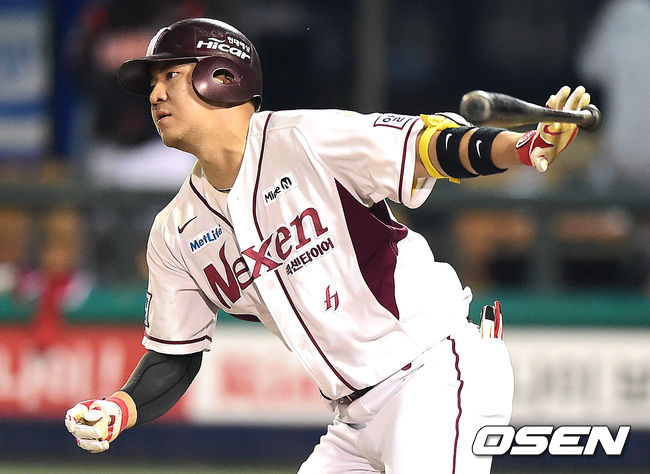 7회말 넥센 공격 1사 만루 상황 김민성이 2타점 좌전 적시타를 날리고 있다.