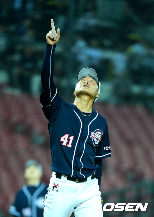8회말 2사 3루에서 두산 정재훈이 KIA 나지완을 1루수 플라이로 처리하며 볼 위치를 가리키고 있다.