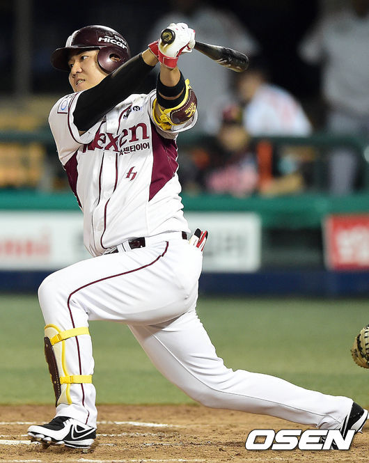 7회말 넥센 공격 1사 만루 상황 김민성이 2타점 좌전 적시타를 날리고 있다.