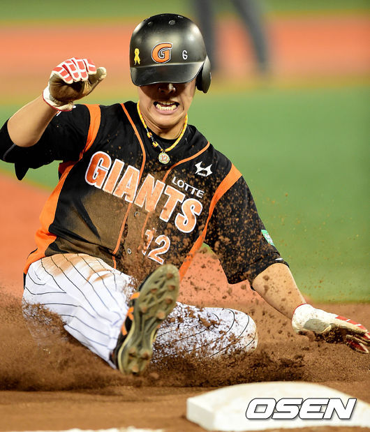 8회초 롯데 공격 1사 1루 상황 손아섭 타석 때 대주자 김민하가 2루 도루에 이어 상대 송구 실책을 틈타 3루까지 내달려 세이프 되고 있다.