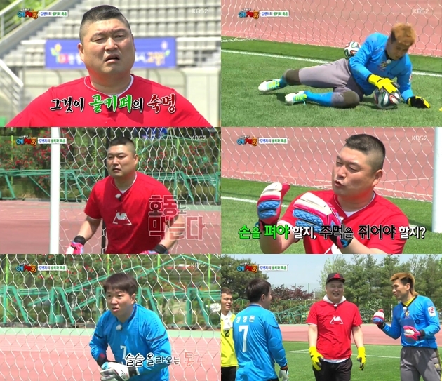 1일 오후 방송된 KBS 2TV '우리동네 예체능'에는 김병지(전남 드래곤즈) 선수에게 골키퍼 특훈을 받는 골키퍼 팀(강호동, 정형돈, 이정)의 모습이 전파를 탔다.