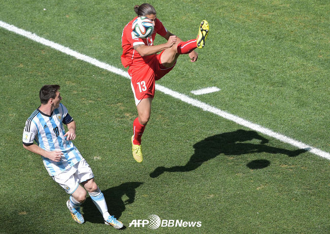 [OSEN=사진팀] 2일 오전(한국시간) 브라질 상파울루 아레나 코린치안스에서 2014 브라질 월드컵 16강전 아르헨티나-스위스의 경기, 전반 스위스의 키라드로 로드리게스가 아르헨티나의 리오넬 메시와 치열한 볼다툼을 하고 있다.