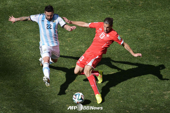 [OSEN=사진팀] 2일 오전(한국시간) 브라질 상파울루 아레나 코린치안스에서 2014 브라질 월드컵 16강전 아르헨티나-스위스의 경기, 전반 스위스의 키라드로 로드리게스가 아르헨티나의 에세키엘 라베치와 치열한 볼다툼을 하고 있다.