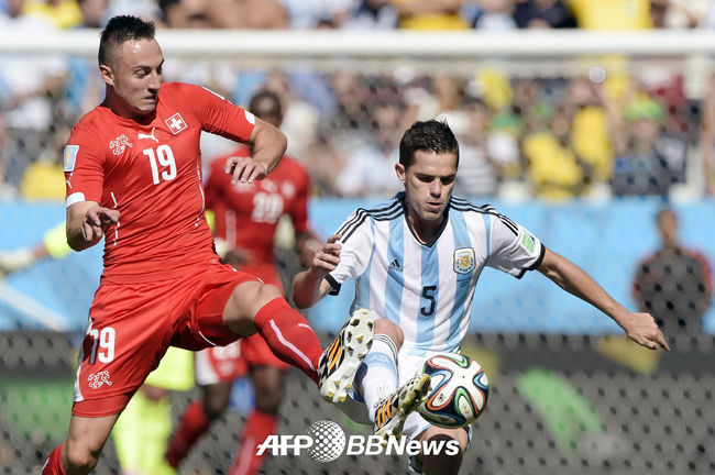 [OSEN=사진팀] 2일 오전(한국시간) 브라질 상파울루 아레나 코린치안스에서 2014 브라질 월드컵 16강전 아르헨티나-스위스의 경기, 전반 스위스의 요시프 드르미치가 아르헨티나 페르난도 가고가 볼다툼을 하고 있다.