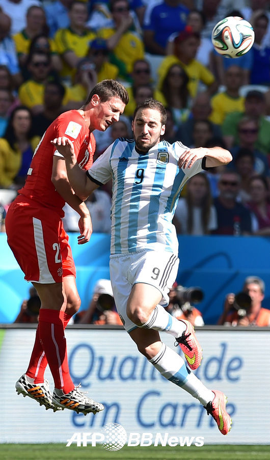[OSEN=사진팀] 2일 오전(한국시간) 브라질 상파울루 아레나 코린치안스에서 2014 브라질 월드컵 16강전 아르헨티나-스위스의 경기, 전반 스위스의 파비안 셰어가 아르헨티나 곤살로 이과인과 볼다툼을 하고 있다.