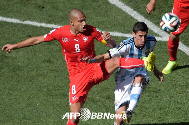 [OSEN=사진팀] 2일 오전(한국시간) 브라질 상파울루 아레나 코린치안스에서 2014 브라질 월드컵 16강전 아르헨티나-스위스의 경기, 후반 스위스 괴칸 인러가 아르헨티나 앙헬 디 마리아와 볼 다툼을 하고 있다.