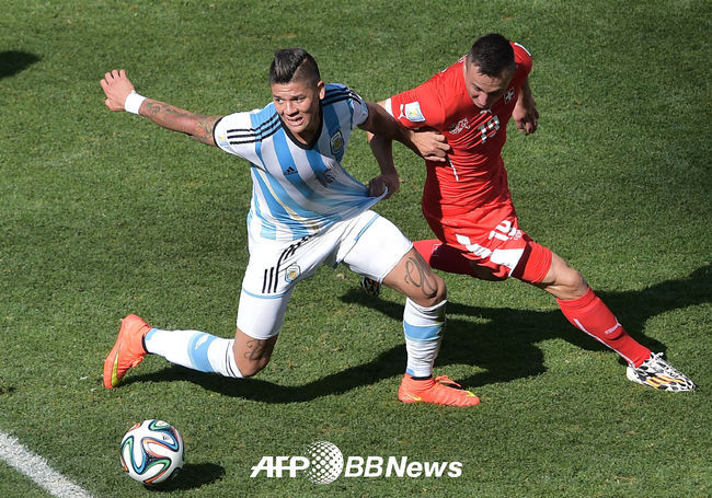 [OSEN=사진팀] 2일 오전(한국시간) 브라질 상파울루 아레나 코린치안스에서 2014 브라질 월드컵 16강전 아르헨티나-스위스의 경기, 후반 아르헨티나의 마르코스 로호가 스위스의 요시프 드르미치가 볼다툼을 하고 있다.