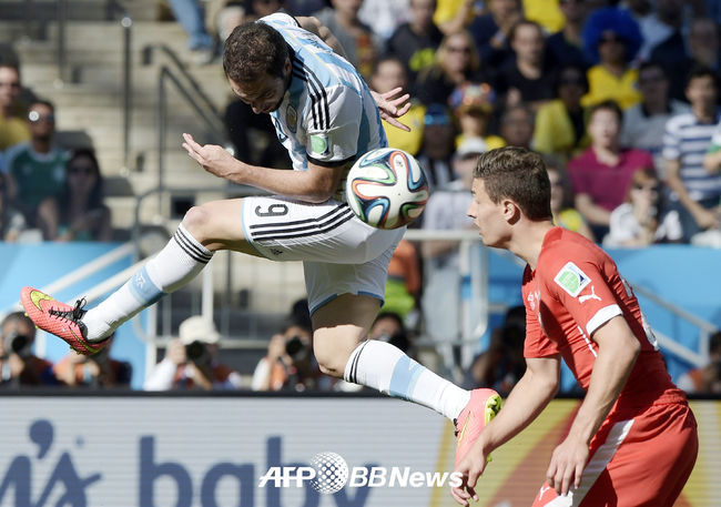 [OSEN=사진팀] 2일 오전(한국시간) 브라질 상파울루 아레나 코린치안스에서 2014 브라질 월드컵 16강전 아르헨티나-스위스의 경기, 후반 아르헨티나의 곤살로 이과인이 헤딩으로 볼을 받아내고 있다.