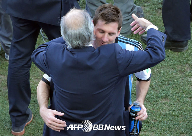 경기를 마치고 아르헨티나 알레한드로 사베야 감독이 리오넬 메시와 포옹을 하고 있다. /photo@osen.co.kr