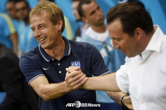 [OSEN=사진팀] 2일 오전(한국시간) 브라질 사우바도르 아레나 폰테 노바에서 열린 2014 브라질 월드컵 16강전 벨기에-미국 경기, 미국 위르겐 클린스만 감독과 벨기에 마르크 빌모츠 감독이 악수를 나누고 있다.