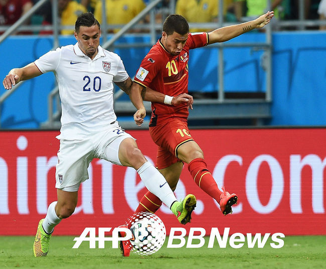 [OSEN=사진팀] 2일 오전(한국시간) 브라질 사우바도르 아레나 폰테 노바에서 열린 2014 브라질 월드컵 16강전 벨기에-미국 경기, 벨기에의 에당 아자르(왼쪽)가 미국 제프 캐머런(오른쪽)과 치열한 볼다툼을 하고 있다.