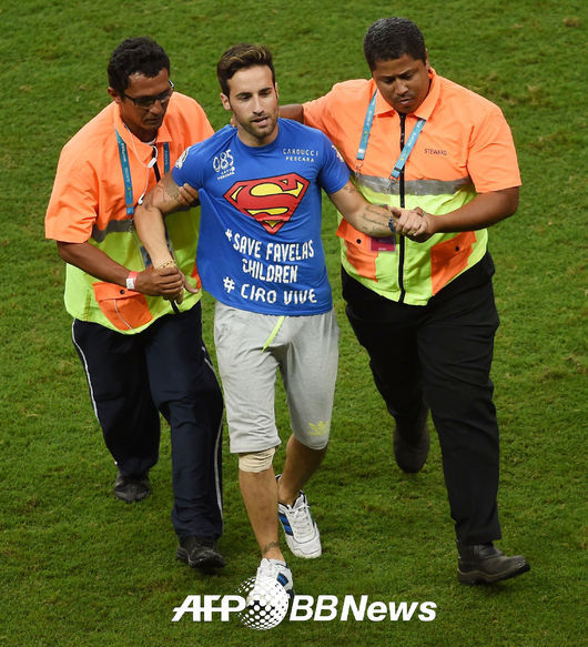 [OSEN=사진팀] 2일 오전(한국시간) 브라질 사우바도르 아레나 폰테 노바에서 열린 2014 브라질 월드컵 16강전 벨기에-미국 경기, 경기장에 난입한 한 팬이 연행되고 있다.