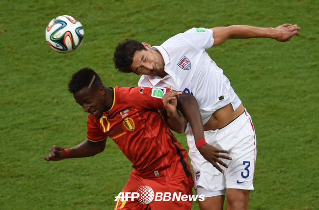 [OSEN=사진팀] 2일 오전(한국시간) 브라질 사우바도르 아레나 폰테 노바에서 열린 2014 브라질 월드컵 16강전 벨기에-미국 경기, 벨기에의 디보크 오리지와 미국 오마르 곤살레스가 공중볼 다툼을 하고 있다.