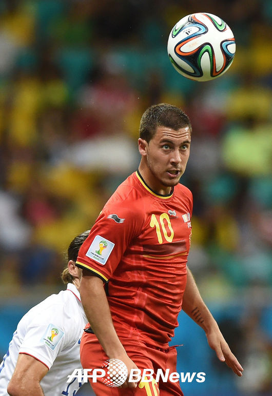 [OSEN=사진팀] 2일 오전(한국시간) 브라질 사우바도르 아레나 폰테 노바에서 열린 2014 브라질 월드컵 16강전 벨기에-미국 경기, 벨기에의 에당 아자르가 공중볼을 받아내고 있다.