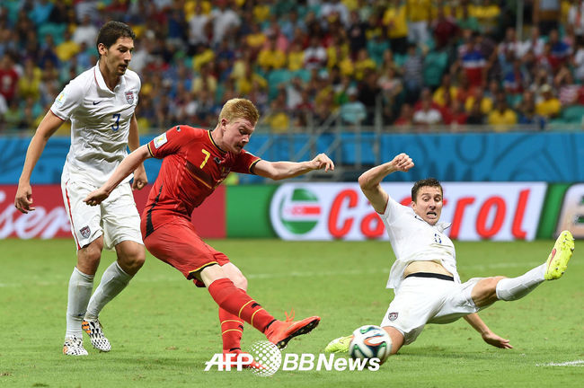 [OSEN=사진팀] 2일 오전(한국시간) 브라질 사우바도르 아레나 폰테 노바에서 열린 2014 브라질 월드컵 16강전 벨기에-미국 경기, 연장 전반 벨기에의 케빈 데 브라이너가 선제골을 성공시키고 있다.