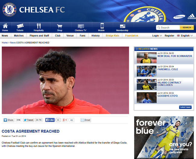 첼시는 2일(이하 한국시간) 공식 홈페이지를 통해 코스타의 영입에 성공했음을 발표했다.