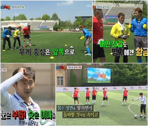 지난 1일 방송된 KBS 2TV 예능프로그램 '우리동네 예체능' 61회에서는 '월드컵 레전드' 김병지, 이천수가 일일 코치로 등장해 강호동과 이규혁도 '우리동네 메시'로 만들어 줄 눈높이 특훈에 나섰다.